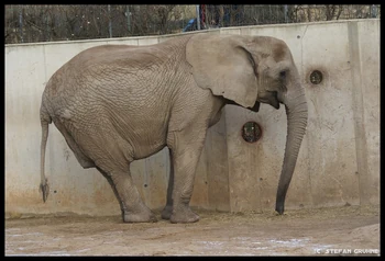 Mit ihrem einzelnen linken Stoßzahn, der kräftigen Statur und dem großen Einschnitt im linken Ohr ist sie gut zu erkennen. Safari ist das größte und ranghöchste Weibchen der Elefantengruppe im Zoopark Erfurt.